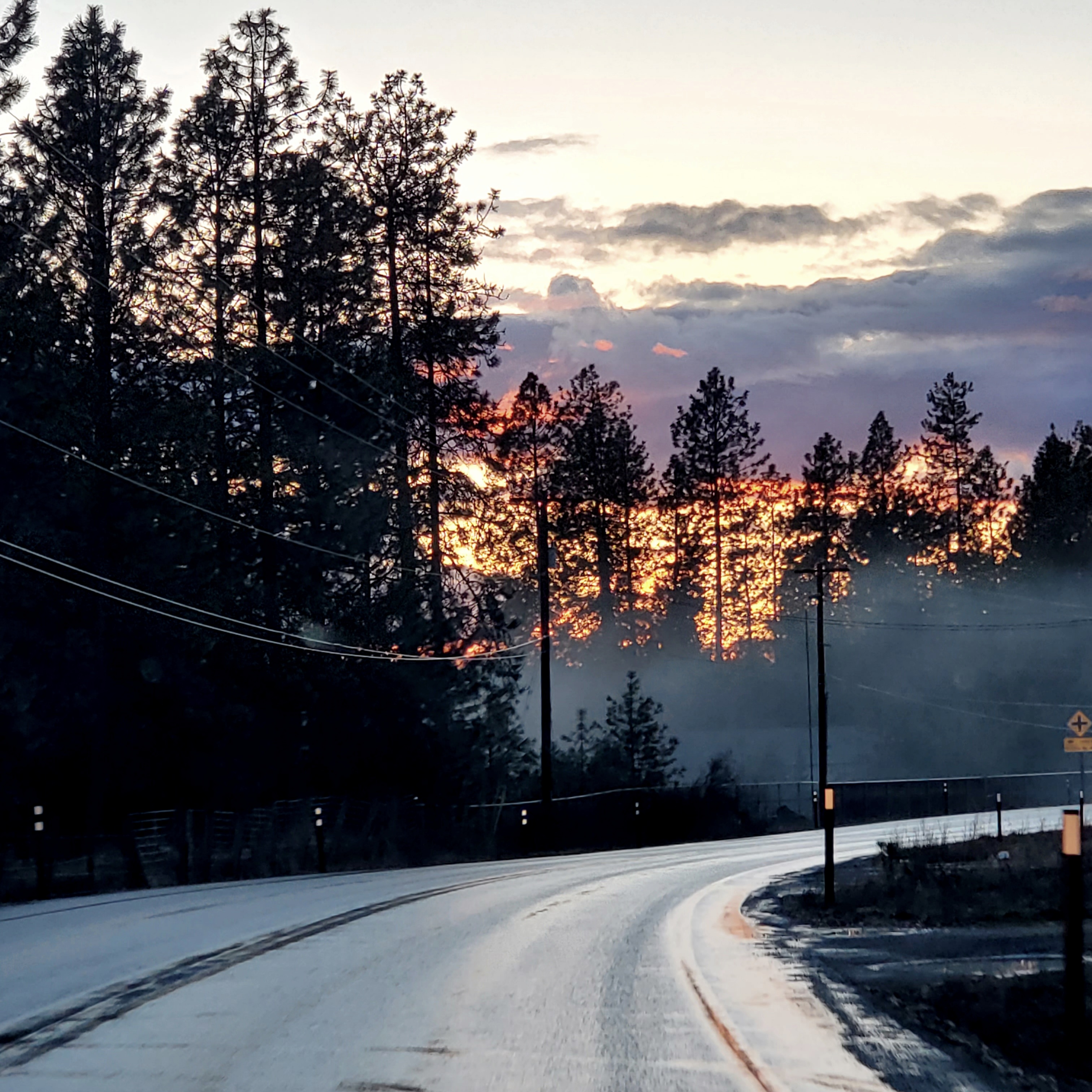 A misty spring sunset looks particularly idyllic as colors pop against the gray mist and wet asphalt.