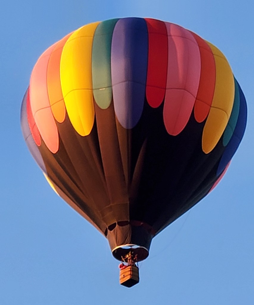 A hot air balloon flies low over Spokane neighborhood…seen from my brother-in-law’s deck!