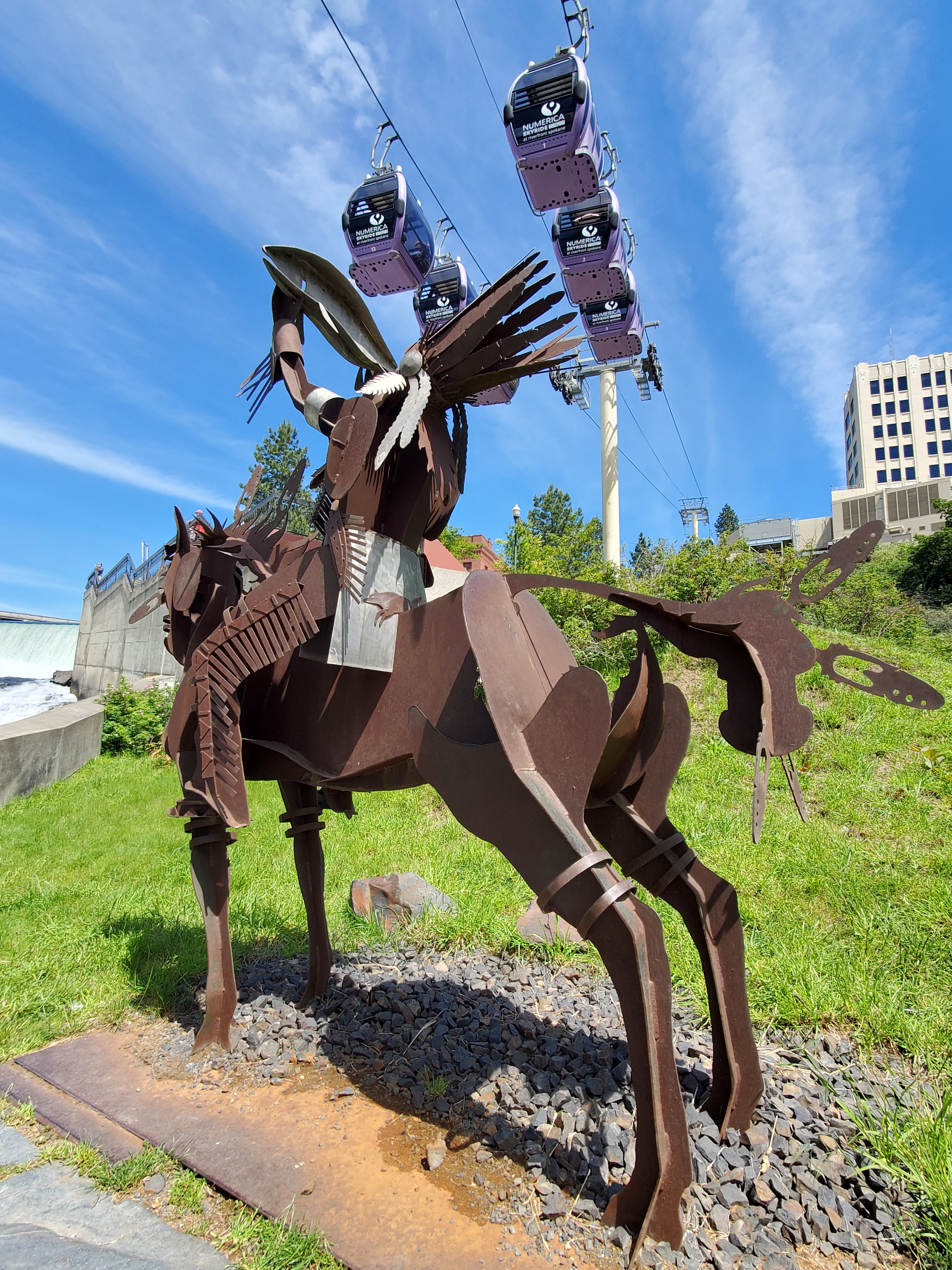 In downtown Spokane’s Riverfront Park, old meets new under the skyway as the iron sculpture of the Salmon Chief seeks a blessing for his catch. The Spokane River’s lower falls that run through the downtown area were a fishing spot for native Americans for thousands of years. This sculpture was created by Colville Reservation native Virgil Marchand.