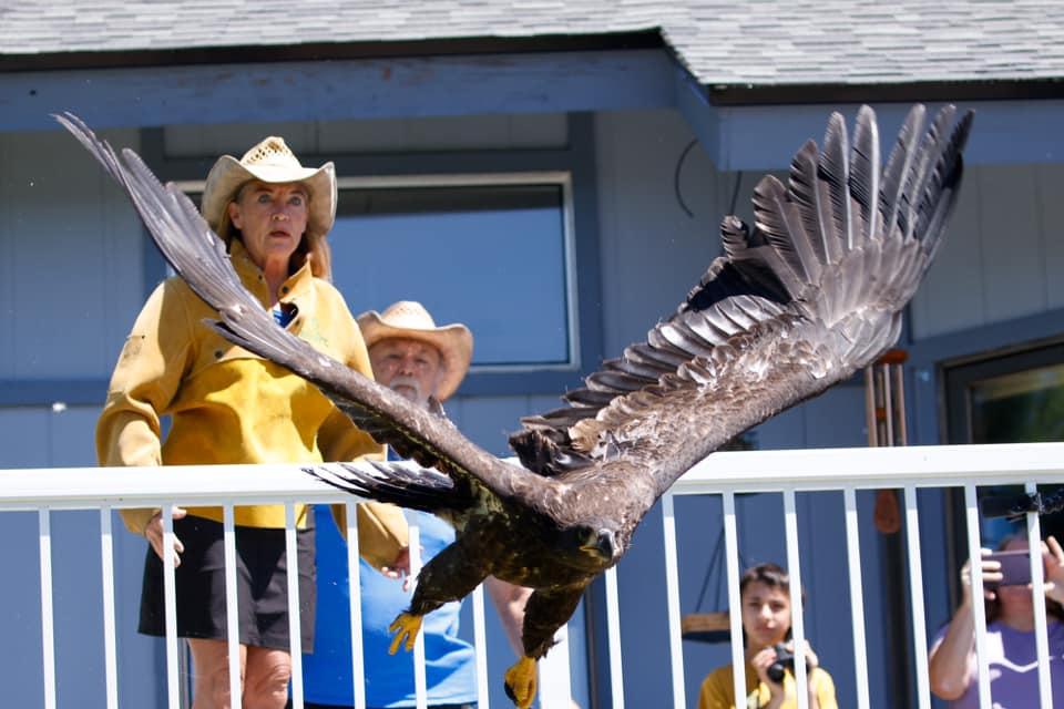Well…Friday, July 16th was the day! KREM 2 news in Spokane, WA, covered the story as Diana G of Bluebell Court Eagles (on Facebook) and Janie Veltkamp, MS, Biology, and director of BOPNW, was there to enable Journey’s first flight since he was rescued. He was launched off Diana G’s deck…